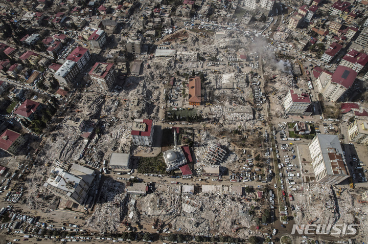 [카흐라만마라스=AP/뉴시스] 9일(현지시간) 튀르키예 남부 카흐라만마라스 중심부의 건물들이 지진으로 파괴돼 있다. 이번 지진으로 인한 사망자 수가 2만 명을 넘어섰으며 이재민들은 모닥불 주위에 모여 추위와 싸우면서 음식과 식수 부족에 어려움을 겪고 있다. 2023.02.10.