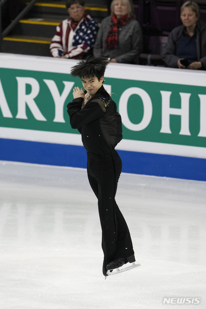 [콜로라도스프링스=AP/뉴시스] 차준환이 9일(현지시간) 미 콜로라도주 콜로라도스프링스 브로드무어 월드 아레나에서 열린 국제빙상경기연맹(ISU) 4대륙선수권대회 남자 쇼트프로그램 연기를 펼치고 있다. 차준환은 기술점수(TES) 41.95점, 예술점수(PCS) 42.82점, 합계 83.77점으로 5위를 기록했다. 2023.02.10.