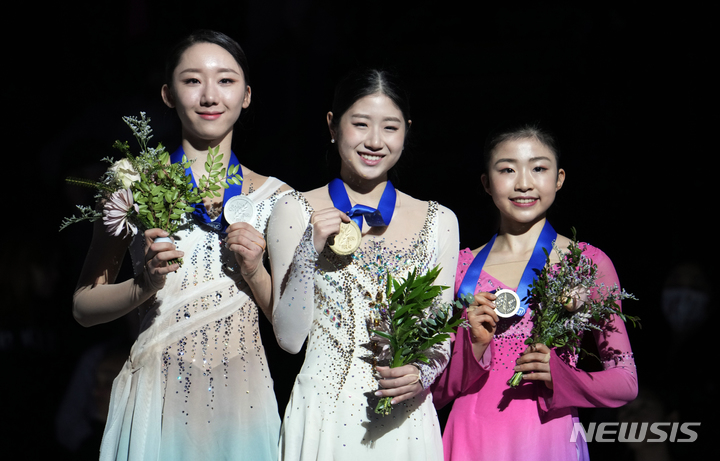 [브로드무어=AP/뉴시스] 이해인(가운데)과 김예림(왼쪽)이 10일(현지시간) 미 콜로라도주 콜로라도스프링스 브로드무어 월드 아레나에서 열린 국제빙상경기연맹(ISU) 4대륙 선수권 여자 싱글 시상식에서 각각 금메달과 은메달을 목에 걸고 포즈를 취하고 있다. 이해인은 기술점수(TES) 74.96점, 예술점수(PCS) 66.75점, 합계 141.71점으로 전날 쇼트 점수를 합한 총점 210.84점으로 우승해 김연아 이후 14년 만에 금메달을 목에 걸었고 김예림은 은메달을 차지했다. 2023.02.11.