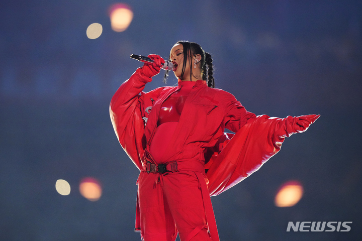 [글렌데일=AP/뉴시스] 가수 리한나가 12일(현지시간) 미 애리조나주 글렌데일의 스테이트 팜 스타디움에서 열린 미프로미식축구(NFL) 슈퍼볼57 캔자스시티 치프스와 필라델피아 이글스의 하프타임 공연을 펼치고 있다. 2023.02.13.