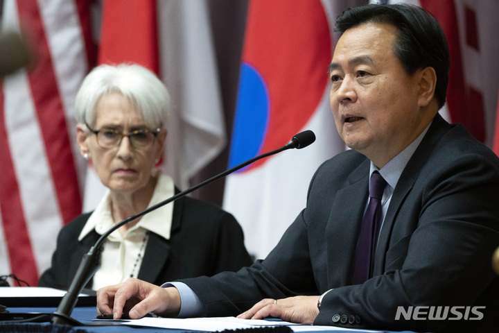 [워싱턴=AP/뉴시스] 조현동 외교부 제1차관이 13일(현지시간) 미국 워싱턴 국무부에서 웬디 셔먼 미 국무부 부장관, 모디 다케오 일본 외무성 사무차관과 회담 후 공동 기자회견을 하고 있다. 한미일 외교차관은 북한 핵 프로그램 포기, 유엔 안보리 결의 준수와 대화 복귀 등을 거듭 촉구했다. 2023.02.14.