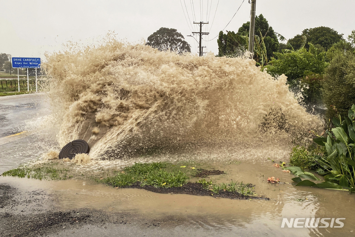 [오클랜드=AP/뉴시스] 14일(현지시간) 뉴질랜드 오클랜드 남동쪽 테 아왕가 거리의 맨홀에서 물이 솟구치고 있다. 뉴질랜드 정부는 사이클론 '가브리엘'이 강타한 북섬 전역에 비상사태를 선포했다. 2023.02.14.
