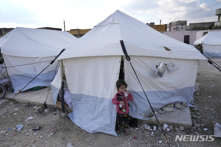 [킬리=AP/뉴시스] 지난 12일(현지시간) 시리아 킬리에 마련된 이재민 대피소 텐트 밖에서 지진으로 가족을 잃은 한 아이가 과자를 먹고 있다. 이번 강진으로 시리아의 사망자 숫자는 약 5800명으로 알려졌다. 2023.02.14.