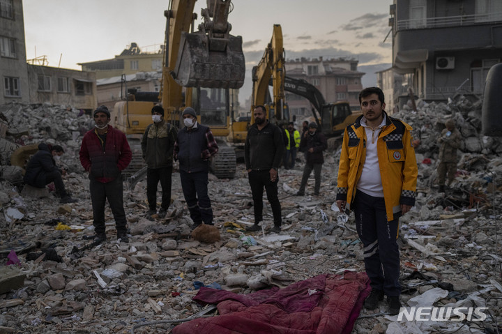 [안타키아=AP/뉴시스] 15일(현지시간) 튀르키예 남부 안타키아에서 한 응급구조사가 주민들과 함께 구조대의 수색 현장을 지켜보고 있다. 이번 강진으로 튀르키예와 시리아 지진 사망자가 4만1000명을 넘어섰으며 세계보건기구(WHO)는 이번 지진을 유럽에서 100년 내 발생한 최악의 자연재해라고 평가했다. 2023.02.16.
