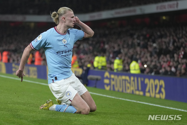 [런던=AP/뉴시스] 맨체스터 시티의 엘링 홀란이 15일(현지시간) 영국 런던의 에미레이트 스타디움에서 열린 2022~23 잉글랜드 프리미어리그(EPL) 아스널과의 12라운드 순연 경기 후반 37분 팀의 세 번째 골을 넣고 세리머니하고 있다. 맨시티는 아스널을 3-1로 꺾고 리그 선두로 올라섰다. 2023.02.16.