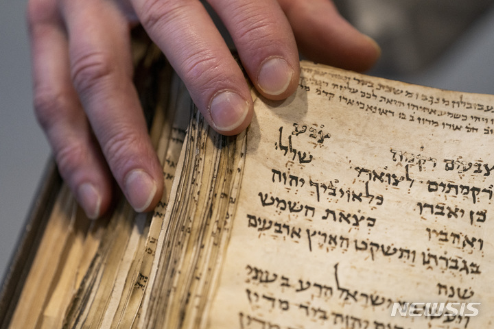 [뉴욕=AP/뉴시스] 15일(현지시간) 미국 뉴욕에서 소더비 경매소가 1100년 전의 히브리어 성경책 '코덱스 사순'을 공개하고 있다. 소더비 측은 오는 5월 경매에 나올 세계 최고(最古)의 성경 '코덱스 사순'의 예상 낙찰가가 3천~5천만 달러(한화 약 387억~645억 원)라고 밝혔다. 이 성경은 12장을 제외하고 온전히 보관된 것으로 알려졌다. 2023.02.16.