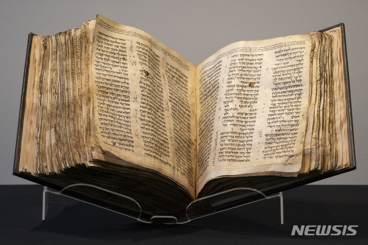 [뉴욕=AP/뉴시스] 15일(현지시간) 미국 뉴욕에서 소더비 경매소가 1100년 전의 히브리어 성경책 '코덱스 사순'을 공개하고 있다. 소더비 측은 오는 5월 경매에 나올 세계 최고(最古)의 성경 '코덱스 사순'의 예상 낙찰가가 3천~5천만 달러(한화 약 387억~645억 원)라고 밝혔다. 이 성경은 12장을 제외하고 온전히 보관된 것으로 알려졌다. 2023.02.16.