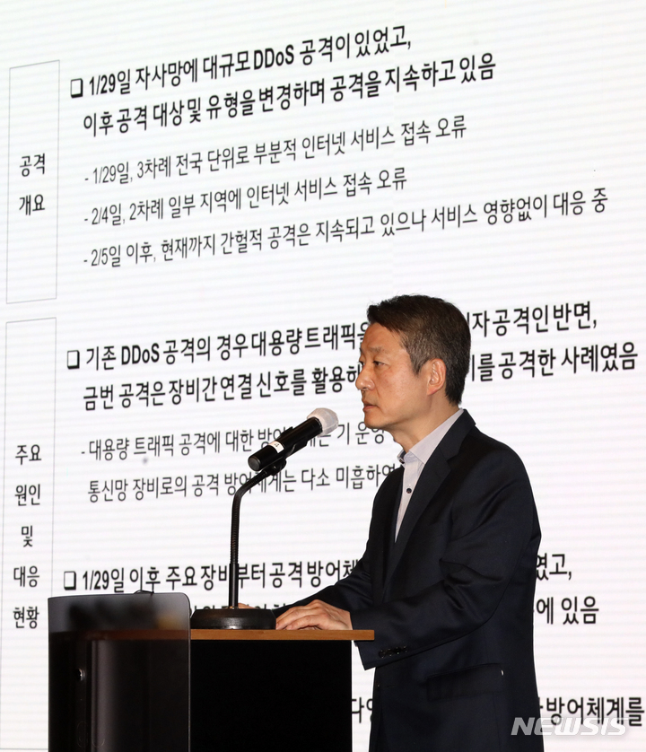 [서울=뉴시스] 최진석 기자 = 권준혁 LG유플러스 부사장이 16일 서울 용산구 LG유플러스 용산사옥 대강당에서 열린 LG유플러스 개인정보 유출 및 디도스(DDoS) 공격 관련 기자간담회에서 디도스 공격 관련 설명을 하고 있다. 2023.02.16. [email protected]