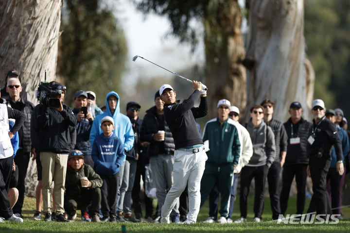 [로스앤젤레스=AP/뉴시스] 김주형이 16일(현지시간) 미 캘리포니아주 로스앤젤레스 인근 퍼시픽 팰리세이즈의 리비에라 컨트리클럽에서 개막한 미국프로골프(PGA) 투어 제네시스 인비테이셔널 첫날 13번 홀에서 어프로치샷을 하고 있다. 김주형은 이븐파로 첫날을 마쳤다. 2023.02.17.