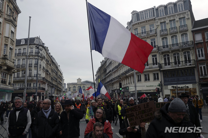 [릴=AP/뉴시스] 16일(현지시간) 프랑스 북부 릴에서 정년 나이를 62세에서 64세로 올리는 연금 개혁안에 반대하는 시위대가 국기를 들고 행진하고 있다. 프랑스 내무부는 전국에서 이어지던 연금 개혁 반대 시위 참여 인원이 점점 줄고 있다고 전했다. 반면 연합 전선을 구축한 노조들은 다음 달 7일 대대적인 파업을 예고했다. 2023.02.17.