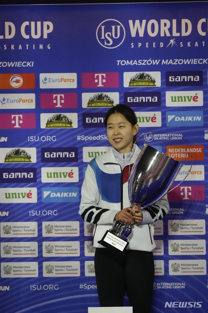 [토마슈프 마조비에츠키=AP/뉴시스] 김민선이 17일(현지시간) 폴란드 토마슈프 마조비에츠키의 로도바 아레나에서 열린 2022~23 국제빙상경기연맹(ISU) 여자 500m 세계 랭킹 1위 시상대에 올라 트로피를 들고 포즈를 취하고 있다. 김민선은 랭킹 점수 354점으로 바네사 헤어초크(오스트리아, 301점)를 크게 제치고 세계 랭킹 1위를 차지했다. 2023.02.18.