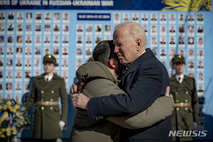 [키이우=AP/뉴시스] 조 바이든(오른쪽) 미국 대통령이 20일(현지시간) 우크라이나 키이우를 깜짝 방문해 러시아-우크라이나 전쟁에서 전사한 군인들의 사진이 붙어 있는 추모의 벽에 헌화한 후 볼로디미르 젤렌스키 우크라이나 대통령과 작별 인사를 하고 있다. 2023.02.21.