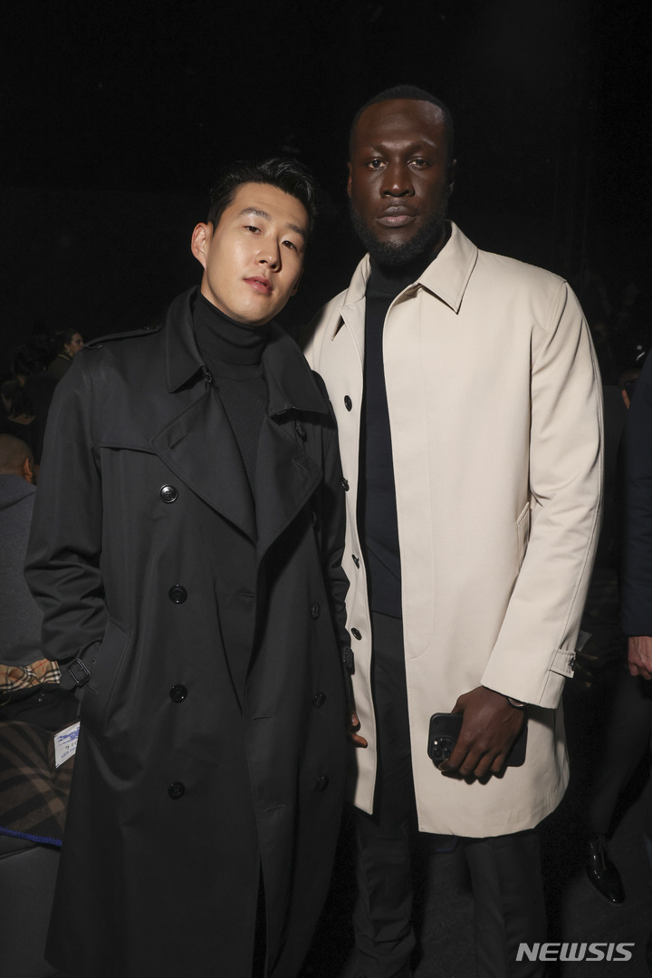 [런던=AP/뉴시스] 토트넘 홋스퍼의 손흥민(왼쪽)과 영국 가수 스톰지가 20일(현지시간) 런던에서 열린 버버리 2023 춘추 패션 컬렉션에 참석해 포즈를 취하고 있다. 2023.02.21.