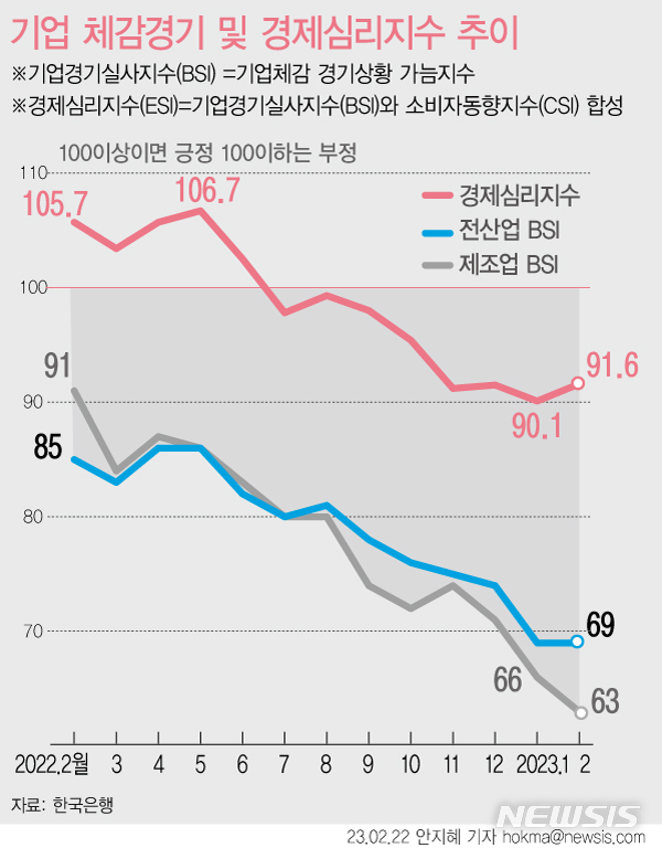 [서울=뉴시스] 반도체 업황 부진이 이어지면서 이번 달 제조업 체감경기가 2년 7개월래 가장 낮은 수준을 보였다. 반면 비제조업은 실내마스크 착용 해제로 소비 심리가 살아나면서 체감경기가 소폭 개선됐다. 이에 따른 전체 기업 체감경기는 지난달과 같은 수준에서 머물렀다. (그래픽=안지혜 기자)