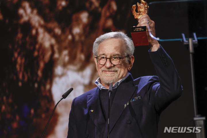[베를린=AP/뉴시스] 스티븐 스필버그 감독이 21일(현지시간) 독일 베를린에서 열리고 있는 베를린 국제 영화제에서 평생 공로상인 명예 황금곰상을 받고 있다. 스필버그는 소감을 말하면서 유대인인 본인이 독일에서 상을 받는 것에 대해 의미를 부여하기도 했다. 2023.02.22.