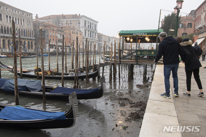 [베네치아=AP/뉴시스] 21일(현지시간) 이탈리아 베네치아에서 사람들이 장기간 이어진 썰물과 가뭄으로 바닥을 드러낸 운하를 바라보고 있다. 베네치아 운하 수로는 고온 건조한 기후와 장기간 지속된 썰물 작용, 가뭄이 겹치면서 일부 강과 수로의 수위가 급격히 낮아지며 바닥을 드러내 곤돌라와 수상택시는 영업을 중단한 채 방치돼 있다. 2023.02.22.