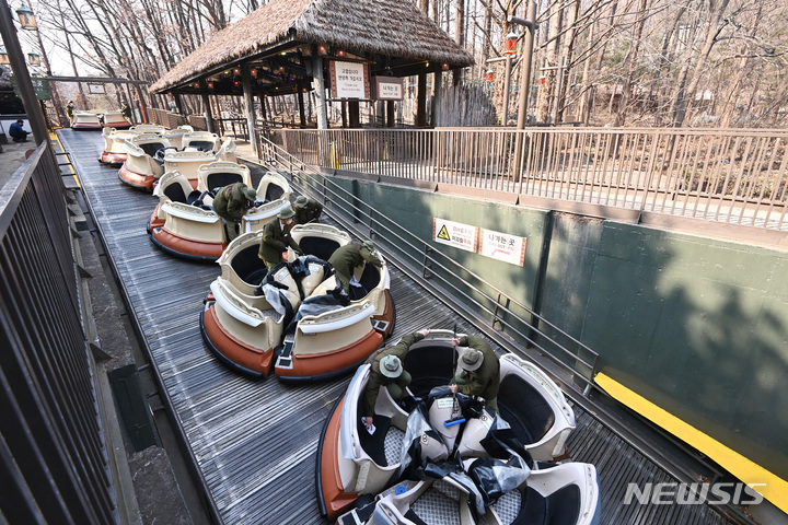 [용인=뉴시스] 김종택 기자 = 23일 오후 경기도 용인 에버랜드에서 겨울철 운행을 중단했던 아마존익스프레스 보트를 관계자들이 청소 및 점검하고 있다. 아마존익스프레스는 오는 24일 본격적인 운행에 들어간다. 2023.02.23. [email protected]