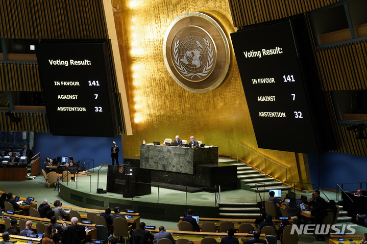 [뉴욕=AP/뉴시스] 23일(현지시간) 미국 뉴욕의 유엔본부에서 유엔 총회가 러시아군의 우크라이나 철수를 요구하는 평화 결의안을 투표 결과를 발표하고 있다. 유엔총회(UNGA)는 이날 우크라이나 전쟁 발발 1년을 맞아 열린 긴급 특별총회에서 러시아군의 철수를 촉구하는 평화 결의안을 가결했다. 2023.02.24.