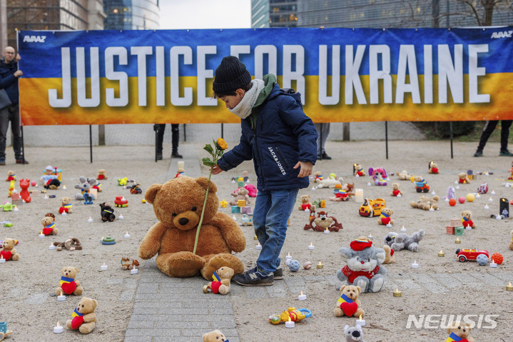 [브뤼셀=AP/뉴시스] 23일(현지시간) 벨기에 브뤼셀의 유럽연합 집행위원회(EC) 앞 광장에서 시민운동 단체 아바즈(Avaaz) 회원들과 우크라이나 난민들이 수많은 우크라이나 어린이가 러시아에 납치된 것에 대한 정의를 요구하며 인형 수천 개를 설치하고 있다. 참석자들은 유럽연합, 미국, 영국, 캐나다 지도자에게 납치에 책임이 있는 것으로 알려진 14명의 러시아 관리들을 제재할 것을 요구하고 있다. 2023.02.24.