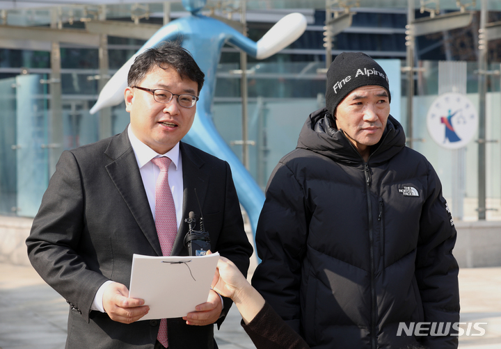 [서울=뉴시스] 김금보 기자 = 서해 피격 공무원 유족 이래진(오른쪽) 씨와 법률대리인 김기윤 변호사가 24일 오전 서울 서초구 서울행정법원에서 열린 대통령기록관장 상대 정보공개청구소송 변론기일 재판을 마치고 브리핑을 하고 있다. 2023.02.24. [email protected]