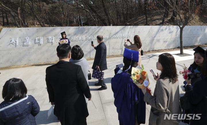 [서울=뉴시스] 최진석 기자 = 서울대학교 졸업생들이 24일 서울 관악구 서울대학교 정문 앞에서 2023년 서울대학교 제77회 학위수여식을 앞두고 기념촬영을 하고 있다. 2023.02.24. [email protected]