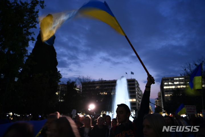 [아테네=AP/뉴시스] 24일(현지시간) 그리스 아테네에서 열린 러시아의 우크라이나 침공 1주년 집회에 참석한 한 남성이 우크라이나 국기를 흔들고 있다. 2023.02.25.
