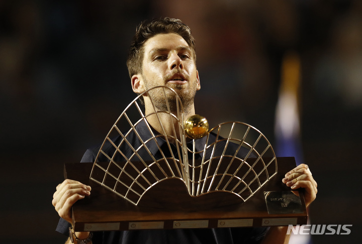 [리우데자네이루=AP/뉴시스] 캐머런 노리(13위·영국)가 26일(현지시간) 브라질 리우데자네이루에서 열린 남자프로테니스(ATP) 투어 리우오픈(ATP 500) 단식 정상에 올라 트로피를 들어 올리고 있다. 노리는 결승전에서 카를로스 알카라스(2위·스페인)를 세트 스코어 2-1(5-7 6-4 7-5)로 꺾고 2주 전 아르헨티나 오픈 결승에서의 패배를 설욕하며 정상에 올랐다. 2023.02.27.