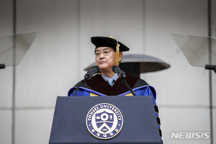 [서울=뉴시스] 정병혁 기자 = 서승환 연세대학교 총장이 28일 서울 서대문구 연세대학교에서 열린 2023학년도 입학식에서 인사말을 하고 있다. 2023.02.28. [email protected]