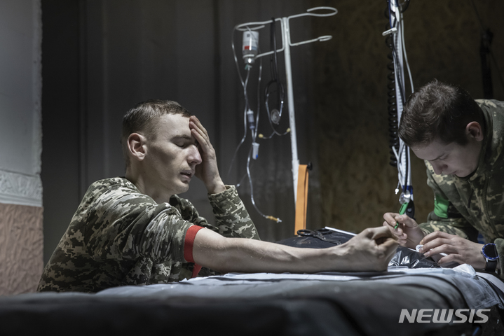 [바흐무트=AP/뉴시스] 지난달 27일(현지시간) 우크라이나 도네츠크주에서 러시아군과 가장 치열한 전투가 벌어지고 있는 바흐무트의 야전병원에서 우크라이나 부상병이 응급 치료를 받고 있다. 2023.03.01.