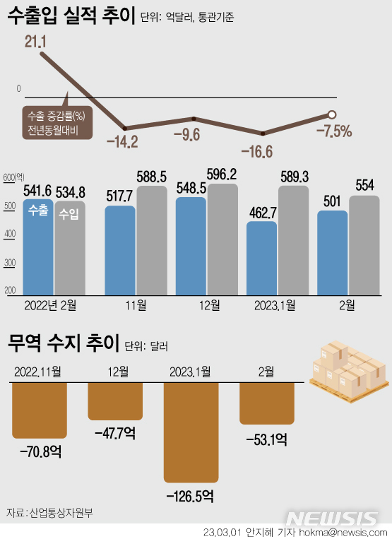 [서울=뉴시스] 1일 산업통상자원부가 발표한 '2월 수출입 동향'에 따르면 지난달 수출은 전년 동월 대비 7.5% 감소한 501억 달러(약 66조3825억원)로 집계됐다. 지난해 11월 감소세로 전환한 뒤 5개월 째 마이너스다. 수입은 전년 동기 대비 3.6% 늘어난 554억 달러(약 73조4050억원)로 무역수지는 53억 달러(약 7조225억원) 적자를 기록했다. (그래픽=안지혜 기자)