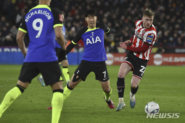 [셰필드=AP/뉴시스] 토트넘 홋스퍼의 손흥민(가운데)이 1일(현지시간) 영국 셰필드의 브래몰 레인에서 열린 2022-23 잉글랜드축구협회(FA)컵 16강전 셰필드 유나이티드와의 경기 중 공을 다투고 있다. 손흥민은 풀타임을 소화했으나 침묵했고 토트넘은 2부 리그 팀인 셰필드에 0-1로 패하며 탈락했다. 2023.03.02.