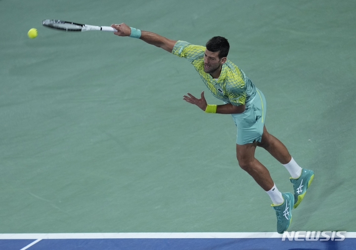 [두바이=AP/뉴시스] 노바크 조코비치(1위·세르비아)가 1일(현지시간) 아랍에미리트 두바이에서 열린 남자프로테니스(ATP) 투어 두바이 듀티프리 챔피언십(ATP500) 단식 16강전에서 탈론 그리에크스푸르(39위·네덜란드)와 경기하고 있다. 조코비치가 2-0(6-2 6-3)으로 이기고 8강에 올랐다. 2023.03.02.