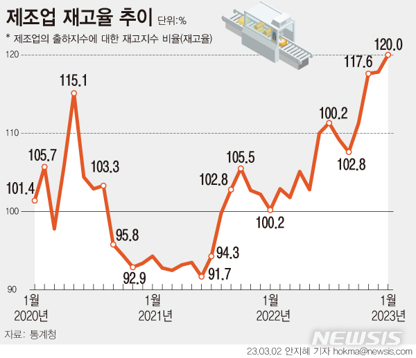 [서울=뉴시스] 2일 통계청이 발표한 '2023년 1월 산업활동동향'에 따르면 1월 제조업의 재고/출하 비율(재고율)은 120.0%로 전월보다 2.2%p 상승했다. 이는 IMF 외환위기 시절인 1998년 7월(124.3%) 이후 가장 높은 수준이다. (그래픽=안지혜 기자)