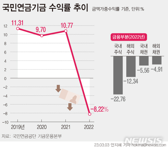 [서울=뉴시스] 국민연금이 주식 및 채권 시장 악화로 지난해 적립금 운용 수익률이 마이너스(-) 8.22%을 기록했다. 3일 국민연금공단 기금운용본부에 따르면 지난해 말 기준 국민연금기금 적립금은 890조5000억원으로 잠정 집계됐다. (그래픽=안지혜 기자)