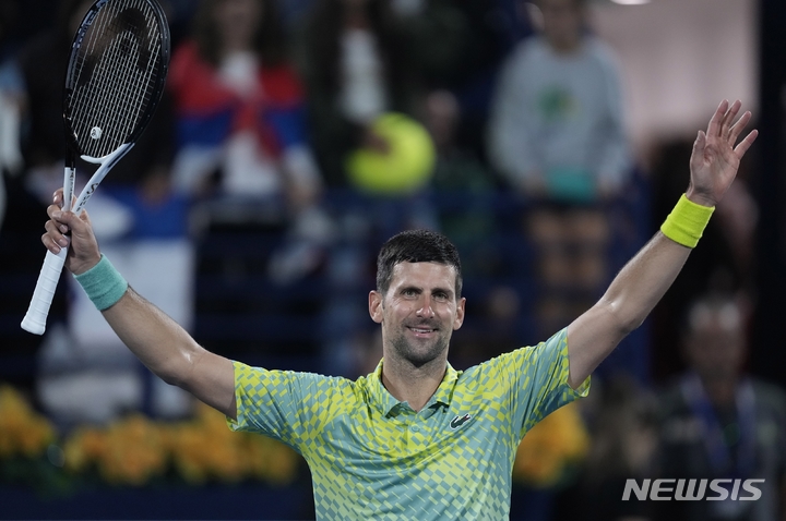 [두바이=AP/뉴시스] 노바크 조코비치(1위·세르비아)가 2일(현지시간) 아랍에미리트 두바이에서 열린 남자프로테니스(ATP) 투어 두바이 듀티프리 챔피언십(ATP500) 단식 8강전에서 후베르트 후르카츠(11위·폴란드)를 물리친 후 기뻐하고 있다. 조코비치가 2-0(6-3 7-5)으로 승리하며 준결승에 올라 다닐 메드베데프(7위·러시아)와 결승행을 다툰다. 2023.03.03.