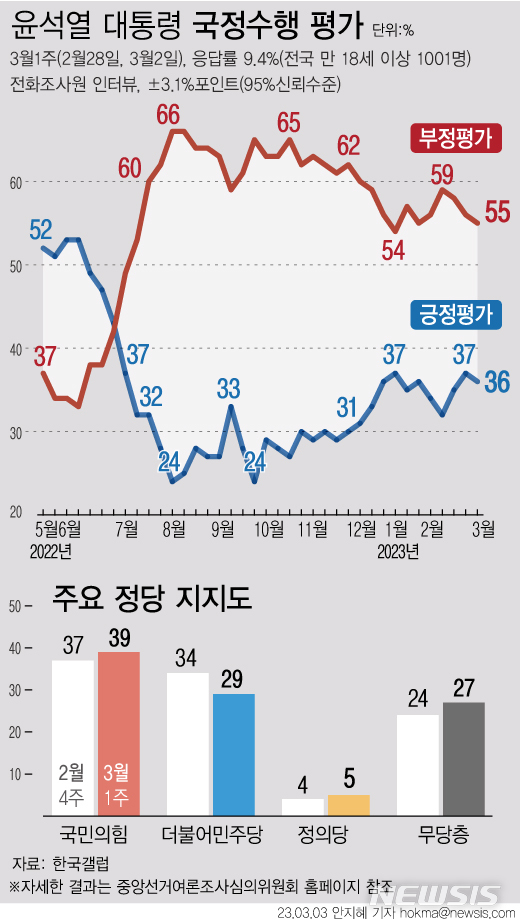 [서울=뉴시스] 한국갤럽이 3월 1주차 윤석열 대통령의 지지율을 조사한 결과 36%가 '긍정 평가'했다. 전주보다 1%포인트 하락한 수치다. 부정평가도 전주 대비 1%포인트 하락한 55%다. 어느 쪽도 아니다는 3%, 모름/응답거절은 5%다. (그래픽=안지혜 기자)