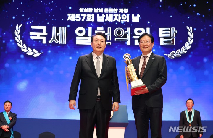 [서울=뉴시스] 홍효식 기자 = 윤석열 대통령이 3일 서울 강남구 코엑스에서 열린 제57회 납세자의 날 기념식에서 김윤태 (주)에코프로이노베이션 대표에게 국세 일천억원 탑을 수여하고 있다여하고 있다. (대통령실통신사진기자단) 2023.03.03. [email protected]