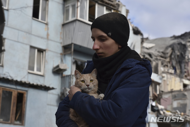 [자포리자=AP/뉴시스] 3일(현지시간) 우크라이나 자포리자에서 한 남성이 러시아군의 미사일 공격으로 파괴된 아파트 건물에서 고양이를 구조해 안고 있다. 이날 공습으로 주민 5명이 숨진 것으로 알려졌다. 2023.03.04.