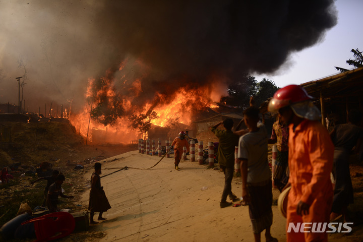 로힝야족 난민 캠프 화재 진압하는 소방관들