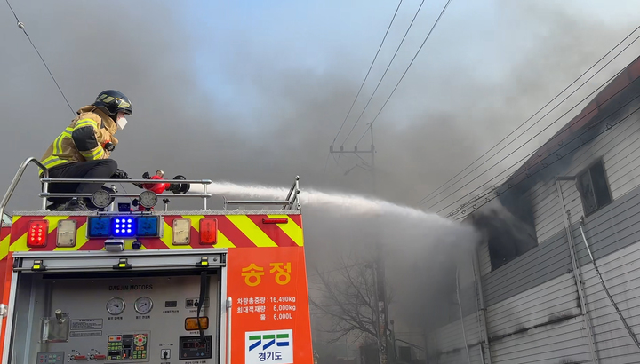 [서울=뉴시스] 6일 오후 경기 화성시 팔탄면의 한 자동차부품 공장에 불이 나 소방당국이 진화 작업을 벌이고 있다. (사진=소방청 제공) 2023.03.06. [email protected] *재판매 및 DB 금지