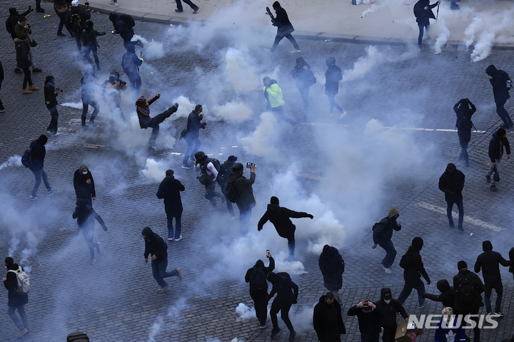 최루탄 발로 차는 프랑스 연금 개혁 반대 시위대