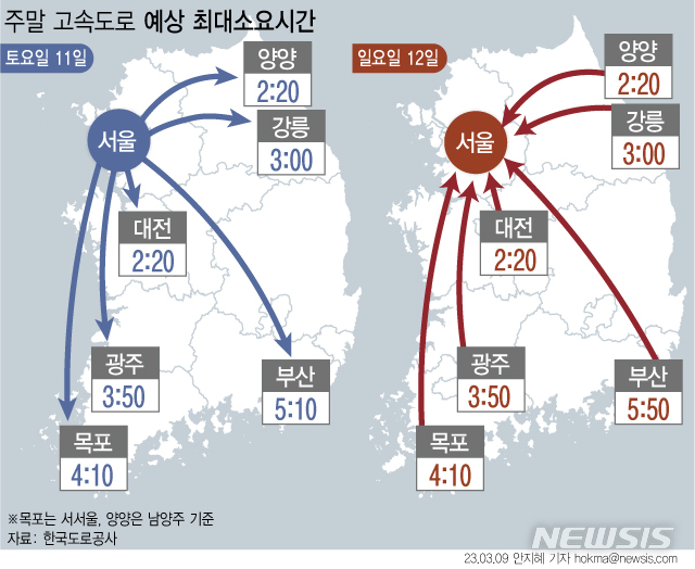 [서울=뉴시스] 10일 한국도로공사는 이번 주말 일요일 비 예보에 고속도로 교통량이 지난 주말보다 감소할 것으로 전망했다. (그래픽=안지혜 기자)