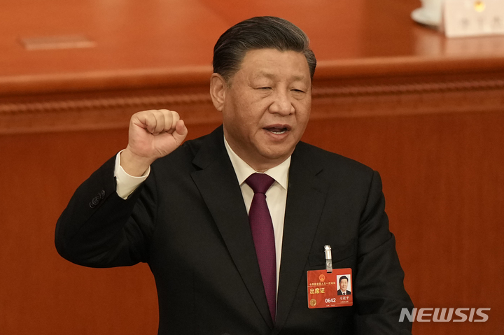 [베이징=AP/뉴시스] 시진핑 중국 국가주석이 10일 베이징 인민대회당에서 열린 전국인민대표대회 14기 1차 회의 제3차 전체회의에서 투표를 통해 만장일치로 주석으로 선출된 후 선서하고 있다. 시 주석은 중국 건국 이후 처음으로 '3연임' 국가주석이 됐다. 2023.03.10.