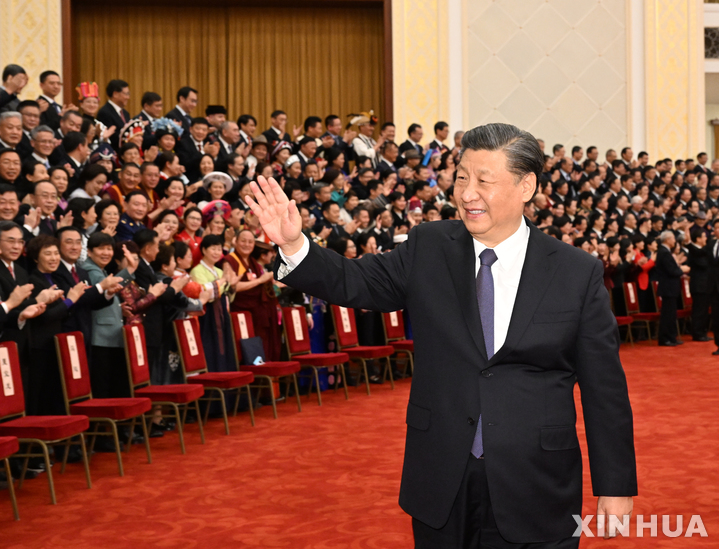 [베이징=신화/뉴시스] 시진핑 중국 국가주석이 11일 베이징 인민대회당에서 열린 제14차 전국인민대표대회 제1차 회의 제4차 전체회의를 마친 후 참석자들과 기념 촬영 전 손을 흔들고 있다. 2023.03.12.