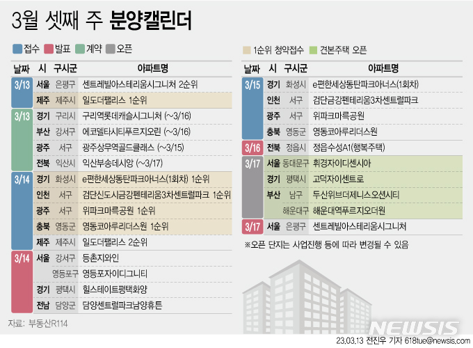 [서울=뉴시스] 11일 부동산R114에 따르면 3월 셋째 주에는 전국 5개 단지 총 2669가구(일반분양 2669가구)가 분양을 시작한다. (그래픽=전진우 기자)