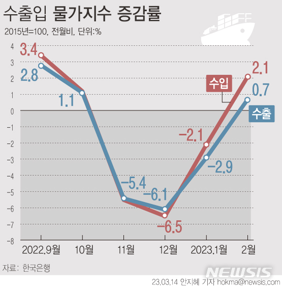 [서울=뉴시스] 14일 한국은행에 따르면 2월 수입물가지수는 138.03(2015=100)로 전월대비 2.1% 상승해 4개월 만에 상승 전환했다. 원·달러 환율과 국제유가가 상승한 영향이 컸다.