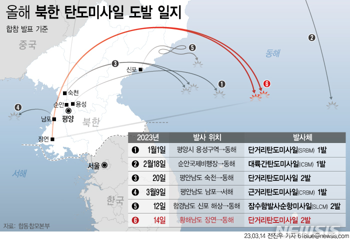 [서울=뉴시스]북한이 14일 오전 7시41분 경부터 7시51분 경까지 북한이 황해남도 장연 일대에서 동해상으로 단거리 탄도미사일(SRBM) 2발를 발사했다. 올해 6번째 미사일 도발이다. (그래픽=전진우 기자)