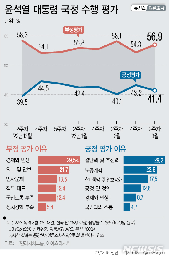 [서울=뉴시스] 뉴시스가 국민리서치그룹·에이스리서치에 3월11~13일 전국 만 18세 이상 남여 1020명을 대상으로 한 여론조사에서 윤 대통령이 국정 수행에 대해 '잘하고 있다'는 응답은 41.4%, '잘못하고 있다'는 56.9%였다. '잘모름'은 1.7%였다. (그래픽=전진우 기자)