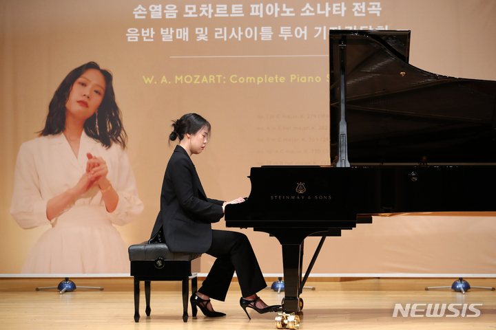 [서울=뉴시스] 조성우 기자 = 피아니스트 손열음이 14일 오전 서울 서대문구 연세대학교 금호아트홀 연세에서 열린 모차르트 피아노 소나타 전곡 음반 발매 및 리사이틀 전국 투어 기자간담회에서 연주하고 있다. 2023.03.14. [email protected]