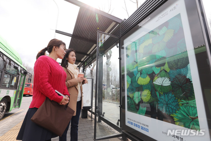 [서울=뉴시스] 김진아 기자 = 15일 오후 서울 서초구 양재시민의숲 버스정류장에서 시민들이 쳥년작가들의 작품을 전시하는 '서리풀 정류장 갤러리'를 관람하고 있다. 서초구가 진행한 이번 '서리풀 정류장 갤러리' 전시는 3월부터 5월까지 3개월간 진행되며, 올해 총 3회에 걸쳐 9개월간 60여명의 청년작가 작품을 마을버스 승차대에 전시할 예정이다. 2023.03.15. [email protected]